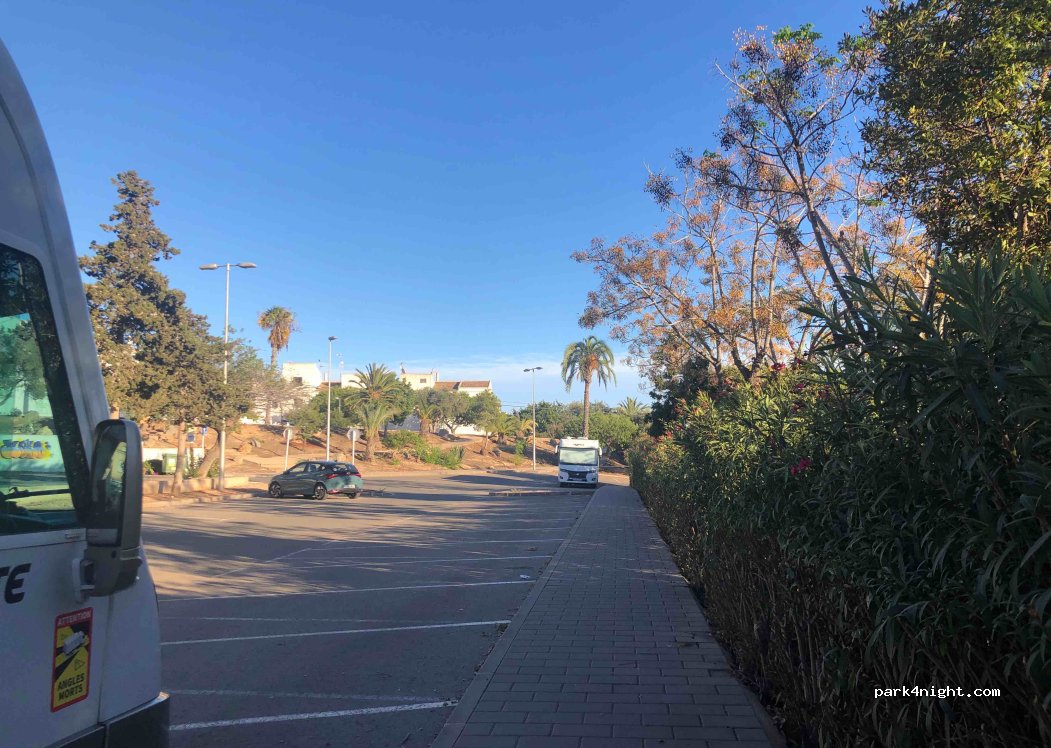 Aparcamiento en zona residencial. No está prohibido aparcar las autocaravanas pero lógicamente sólo se puede utilizar fuera de temporada para no causar molestias ya que no se puede aparcar en la pendiente por falta de profundidad de las plazas. Ligeramente inclinado pero posible sombra y limpio. Botes de basura disponibles. Lo intentamos por una noche ya que no hemos encontrado una opción más adecuada.