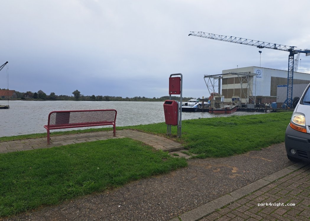Leuke plek op een industrieterrein aan het water. Bankje met uitzicht.