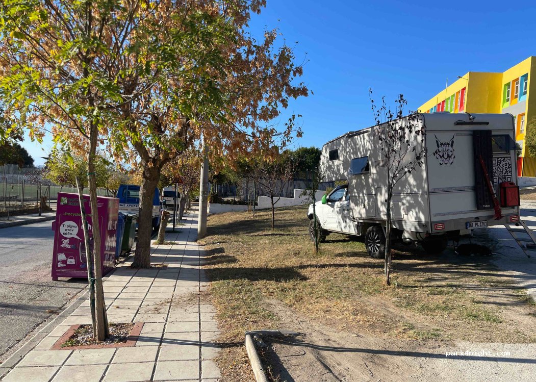 Néapoli. Un quartier de Thessalonique. Places de parking gratuites pour petits et grands mobil-homes. Je suis ici parce qu'un de mes amis vit ici. Aucun panneau d'interdiction. Les habitants sont très gentils et commencent tout de suite à discuter. Tous commerces, bars, restaurants etc. à proximité. Parcours pour chiens donné. Idéal pour un séjour de deux nuits. Les liaisons en bus vers la ville coûtent 0,90 €.