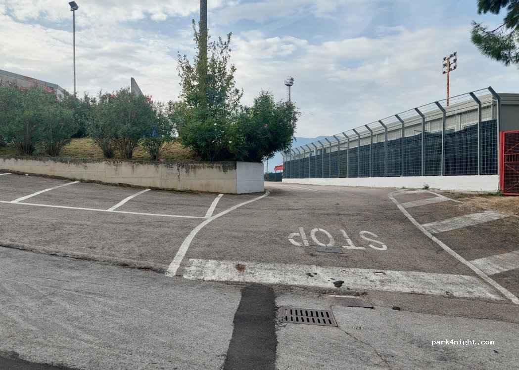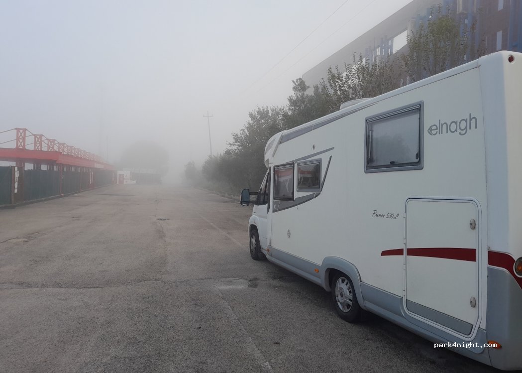 sosta in viaggio, non lontano dall autostrada, molto silenzioso la notte, illuminato e sicuro. Entrata agevole, parcheggio di impianti sportivi
