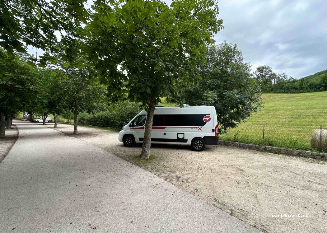 Aire de la grotte. En bord de route mais calme à partir de 20 h. Sanitaire H 24. Bon pour une étape tranquille. Gratuit mais limité à 48h ce qui est suffisant. Rivière à proximité avec le bruit qui va avec, parfait pour s’ endormir.