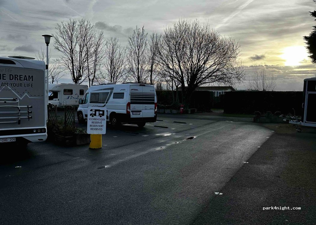 Nous sommes arrivés vers 12h. Il restait un peu de place. 2 choix. Soit parking avec accès sanitaires pour 36 euros, une nuit 2 adultes et 2 enfants)Emplacement soit 42 euros au camping sur emplacement herbeux, assez grand pour mettre un table. Pas un grande différence de prix et surtout plus agréable au camping. Sanitaire nickel. Mais douche non utilisée car supplément de 2 euros pour eau chaude. Delhaize à 10 min à pied. Pratique