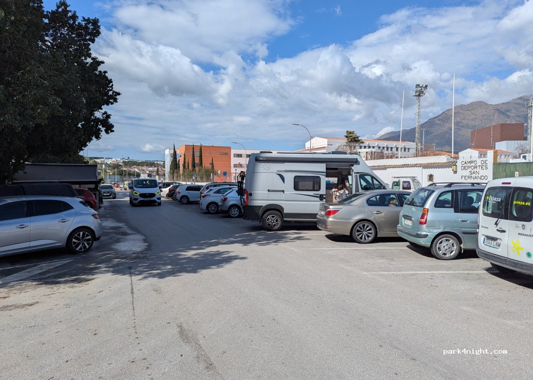 When parked backwards, a 6.5 meter camper with extra length fits through the bicycle rack. pieces or 6 parking spaces. one is empty. they are straight spots. fairly quiet on the field. feels safe.
