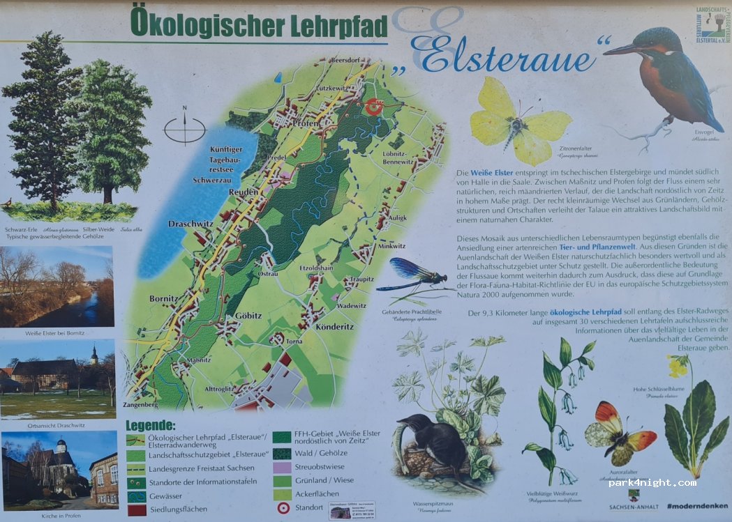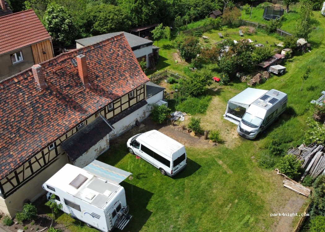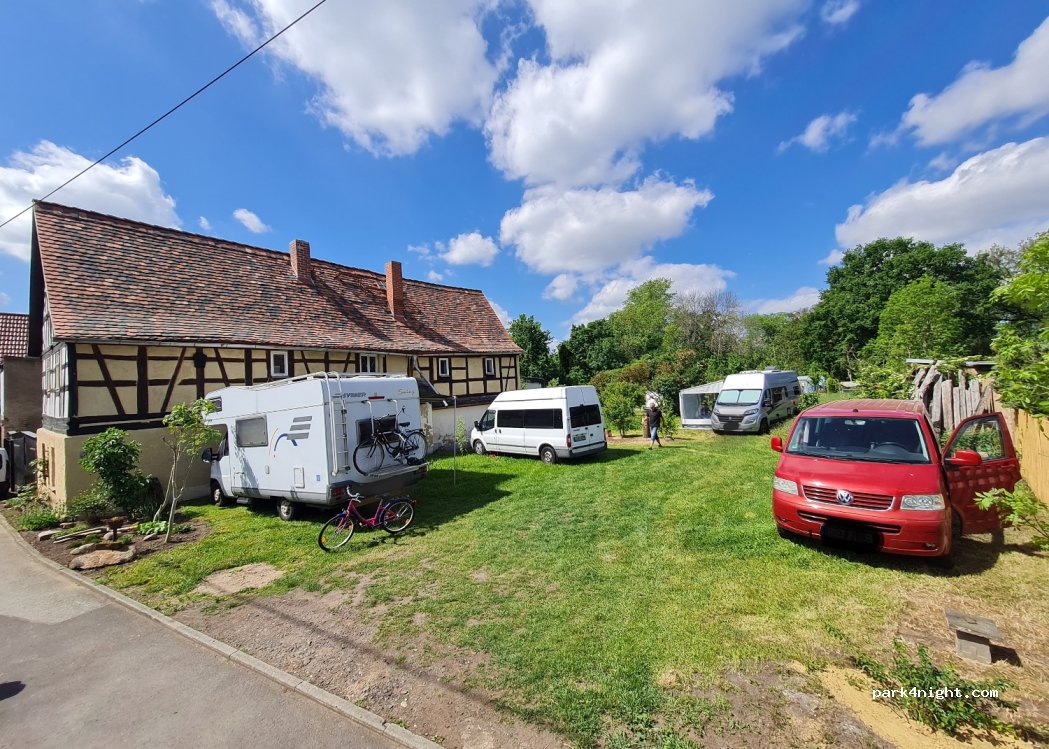 Privates Grundstück am Ende einer Sackgasse (Wohnmobil max. 6,50m lang). Stellplatz vor einem Fachwerkhaus. Von März bis November Wasseranschluss und Entsorgung. Strom. Maximal 3 Wohnmobil Plätze, bitte vorher anrufen. Elster-RadWeg fast vor der Haustür.