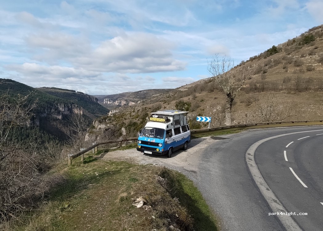 Petit espace pour se garer en bord de route, jolie vue sur la vallée et les gorges. Evitez cet endroit si vous avez un gros véhicule, espace dans un virage.