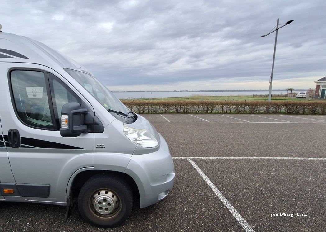 Gemengde parking met 4 voorbehouden plaatsen voor campers. Zicht op het water en de voorbijvarende boten.