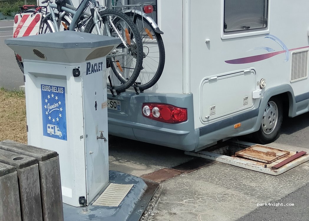 Trappe de vidange des eaux grises pas très accessible. Un seul robinet pour l'eau potable et le rinçage de la cassette des wc. Pas de rinçage de la trappe eaux noires. Pas très hygiénique... Mais le tout est gratuit ! Merci quand même à la commune.