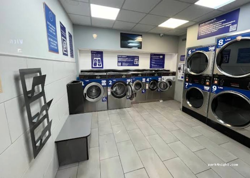 Lavandería pequeña, con 5 lavadoras de distintos tamaños y 4 secadoras.
