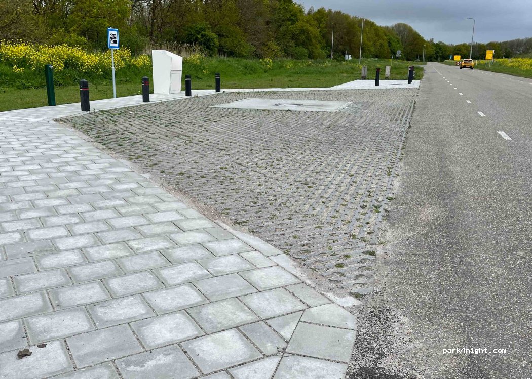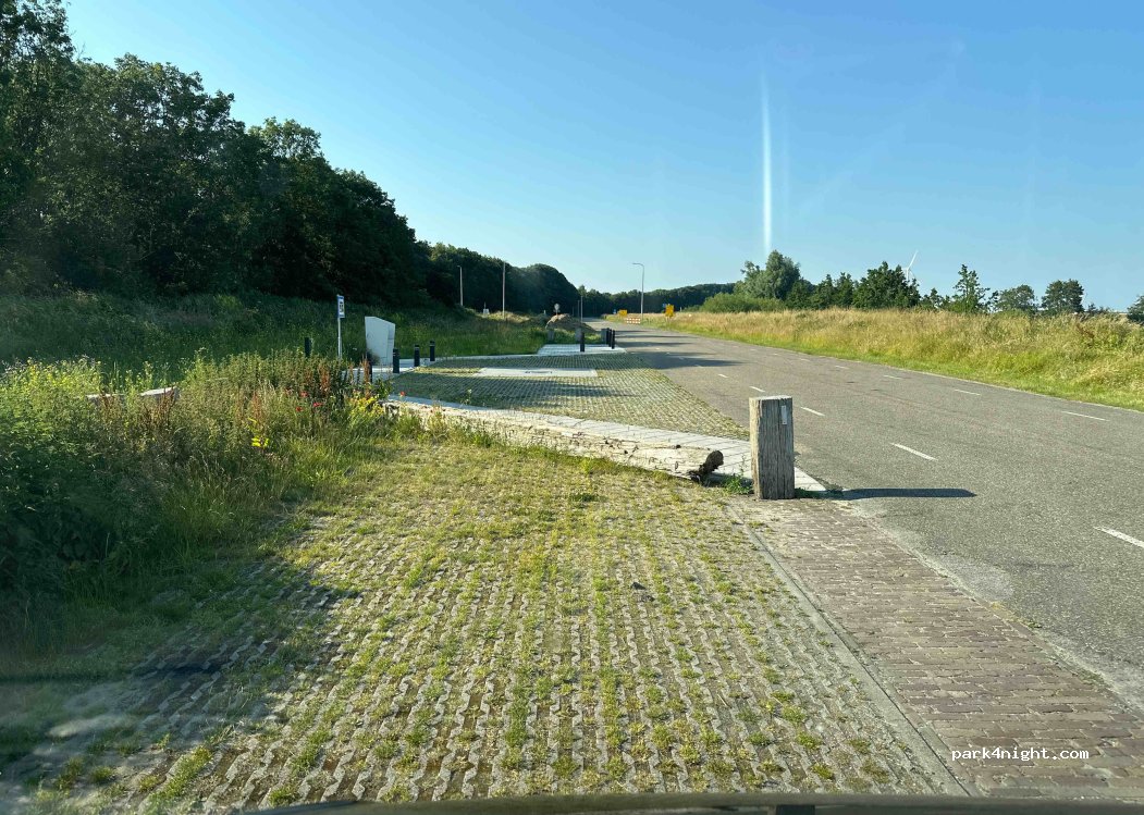 Aparcamiento frente al lago IJsselmeer, al borde de una carretera con poco tráfico. Ruido de la autopista cercana, pero no demasiado molesto. Drenaje de aguas grises y negras y recarga de agua gratuitos.