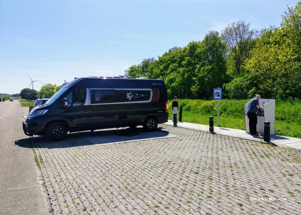 Parking face à l'IJsselmeer, au bord d'une route peu fréquentée. Bruit de l'autoroute à proximité mais pas vraiment gênant. Vidange et remplissage d'eau gratuits pour les eaux grises et noires.
