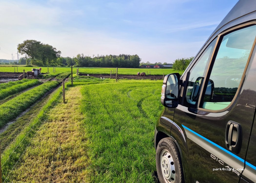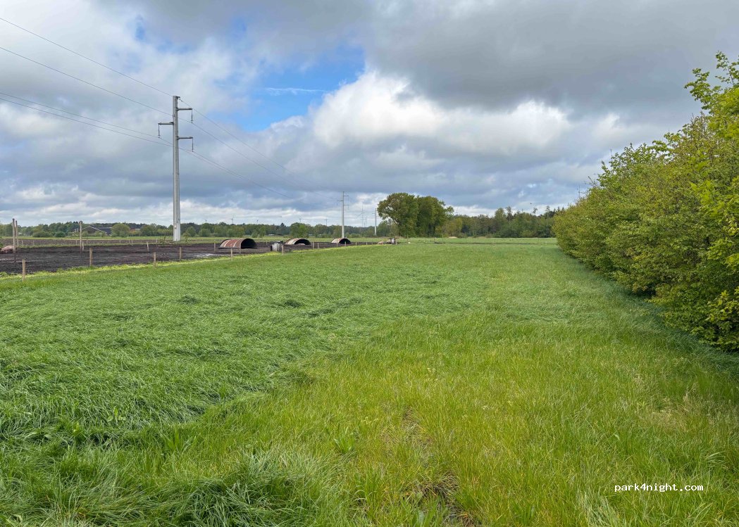 Een uitgestrekt grasveld waar u vrij kunt kamperen. Er zijn geen voorzieningen, dus laat geen afvalwater of afval achter. U bevindt zich hier in het gezelschap van duurzaam gefokte varkens. Zeer rustige omgeving. Na aankomst werd ik hartelijk ontvangen door de exploitant. Bij het inrijden dient u rustig te rijden en links van de winkelcontainer te blijven. Let op het fietsenrek langs de inrit.