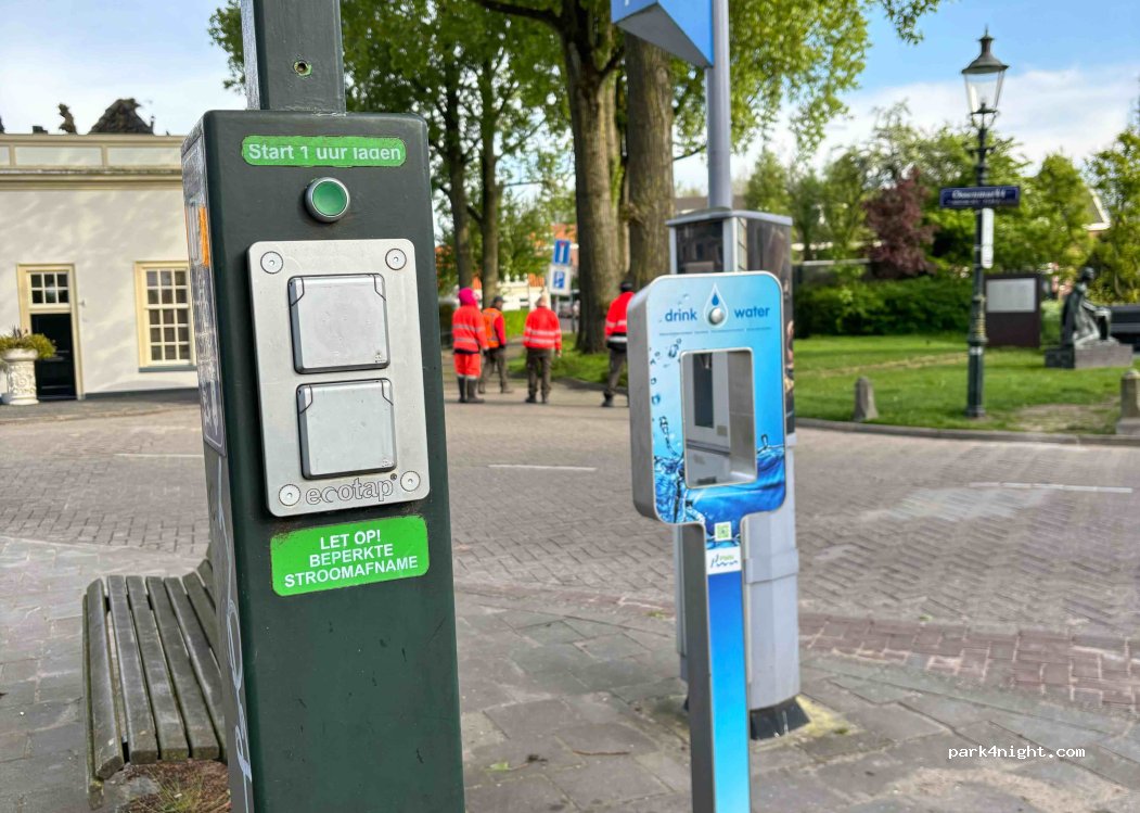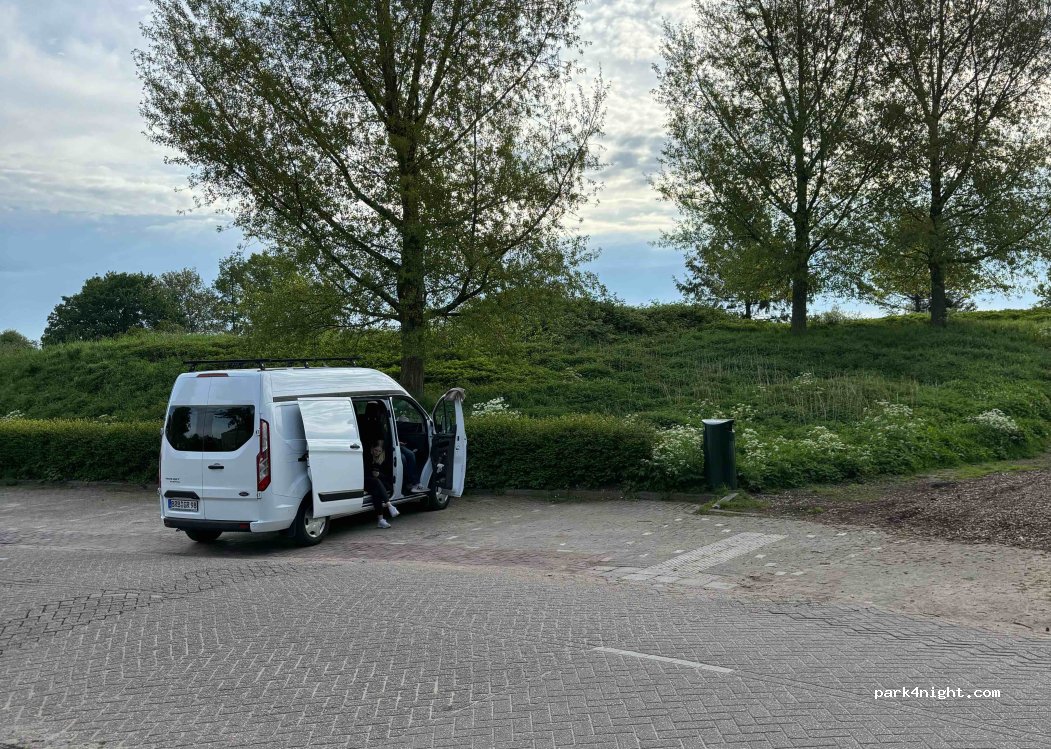Parking gratuit directement à Weesp dans un ancien bastion. Juste à côté du parking se trouve un barrage bastion herbeux qui mène directement à l'eau. Il y a même un distributeur d'eau potable gratuit à proximité et une borne de recharge avec 2 prises Schuko (même si les places de parking à côté semblent payantes en journée).