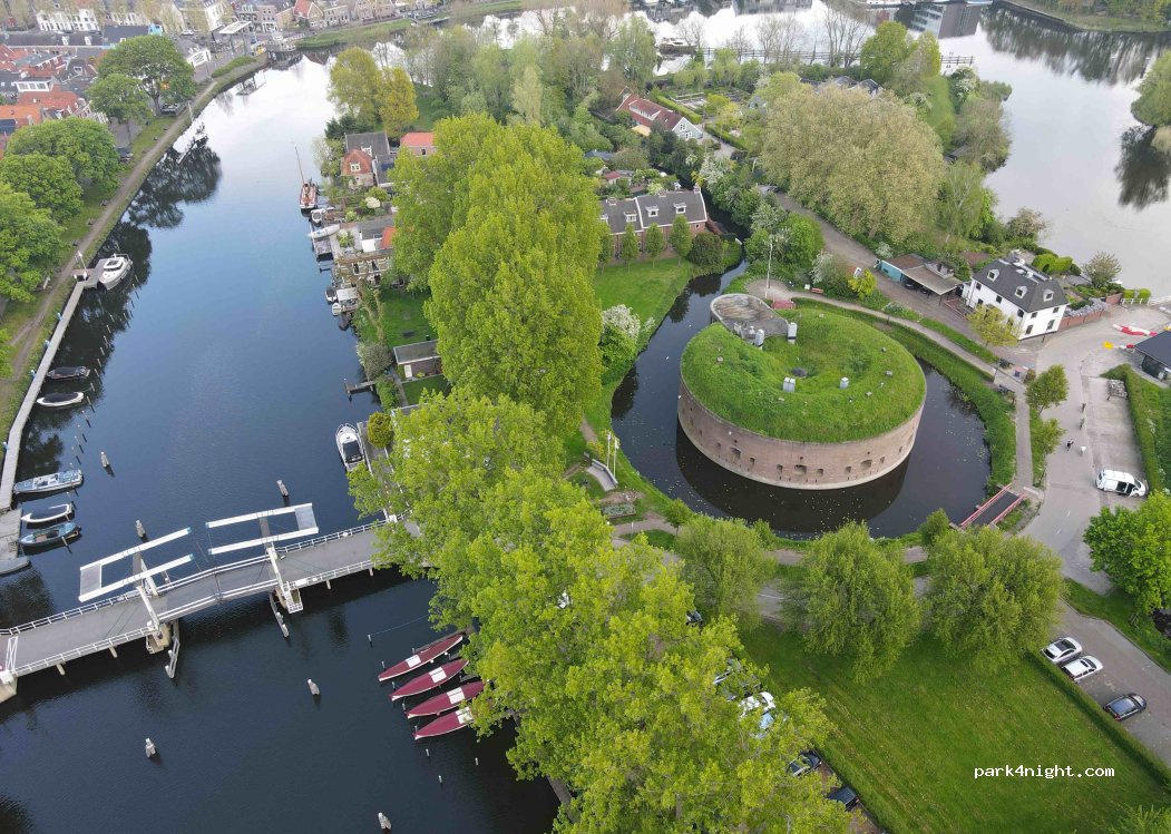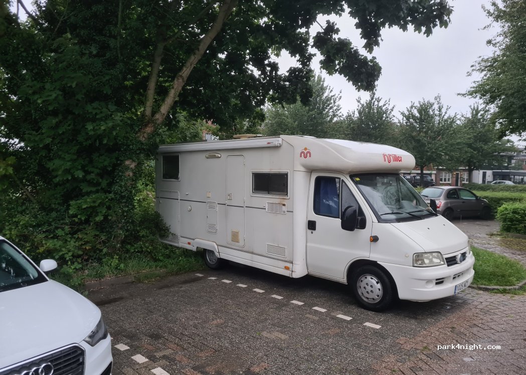 Free parking directly in Weesp at an old bastion. Right next to the parking lot there is a green weir of the bastion, which leads directly to the water. There is even a free drinking water dispenser and a charging station with 2 Schuko sockets nearby (the parking spaces next to it seem to be subject to a fee during the day, however). 2 Spaces for larger motorhomes than 5 meters. You need to get lucky.