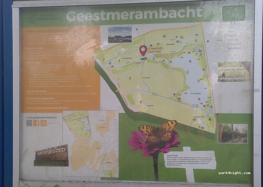 Gemakkelijk parkeren bij het natuurgebied. Overnachten verboden. Veel fietsers en wandelaars.