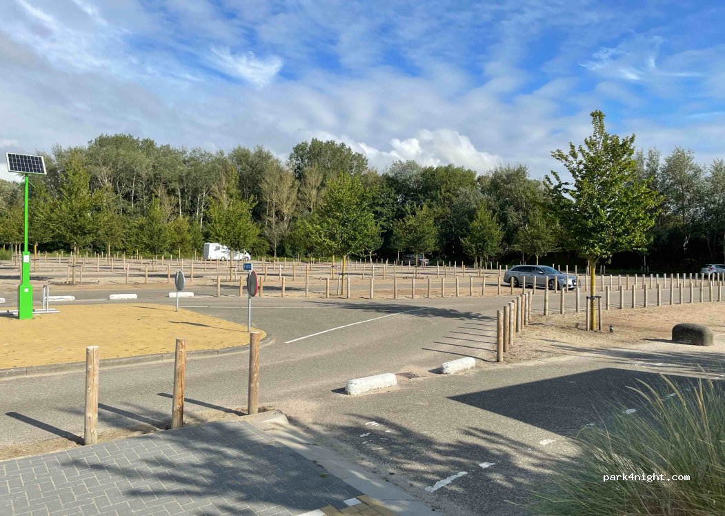 Grote parkeerplaats vlakbij het strand. Geen lengtebeperkingen. Betaald parkeren van april tot oktober.