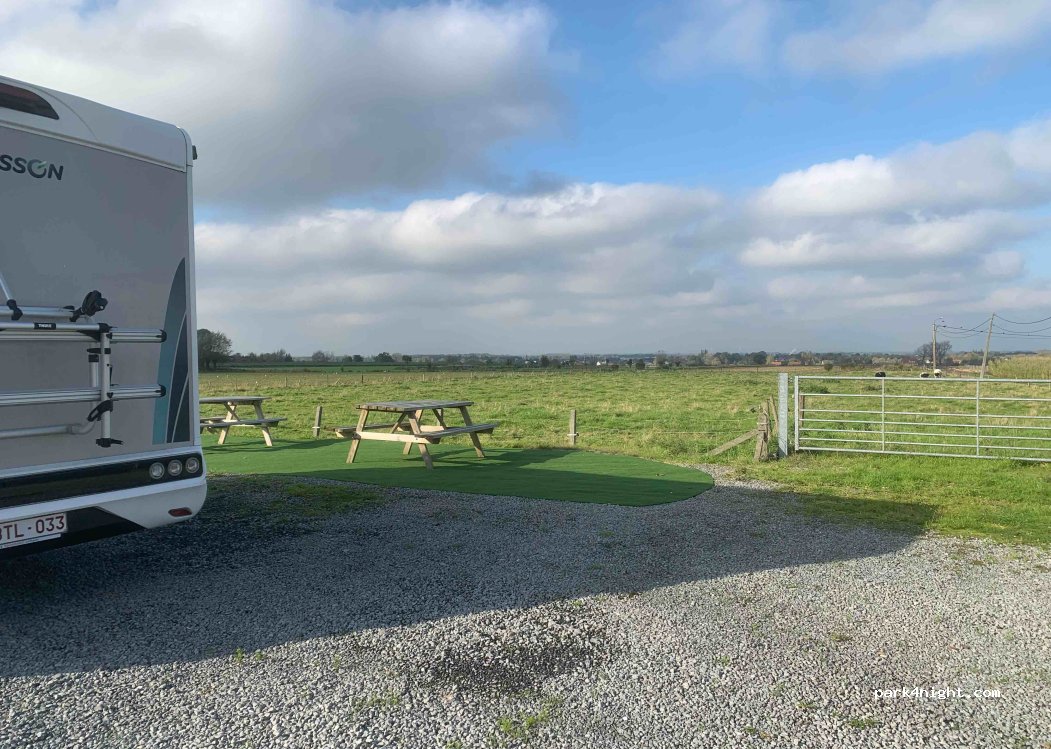 Wat een uitzicht!! Een heerlijk rustig plekje om even helemaal bij te komen. Haasjes die huppelen door de wei, een koe die je goedemorgen loeit en een beheerder/eigenaar die werkelijk alles doet om je een comfortabel verblijf te geven. En behalve stroom/water niet veel faciliteiten, maar voor een paar dagen is dat geen probleem. Je grijs/zwart water kun je 10 minuten verderop (in Kortemark) lozen.