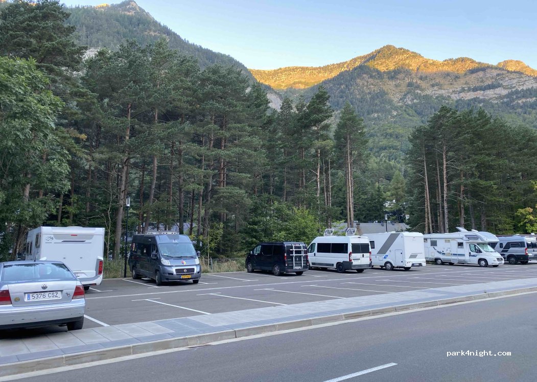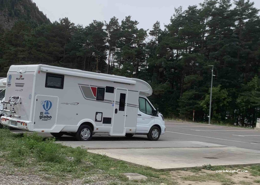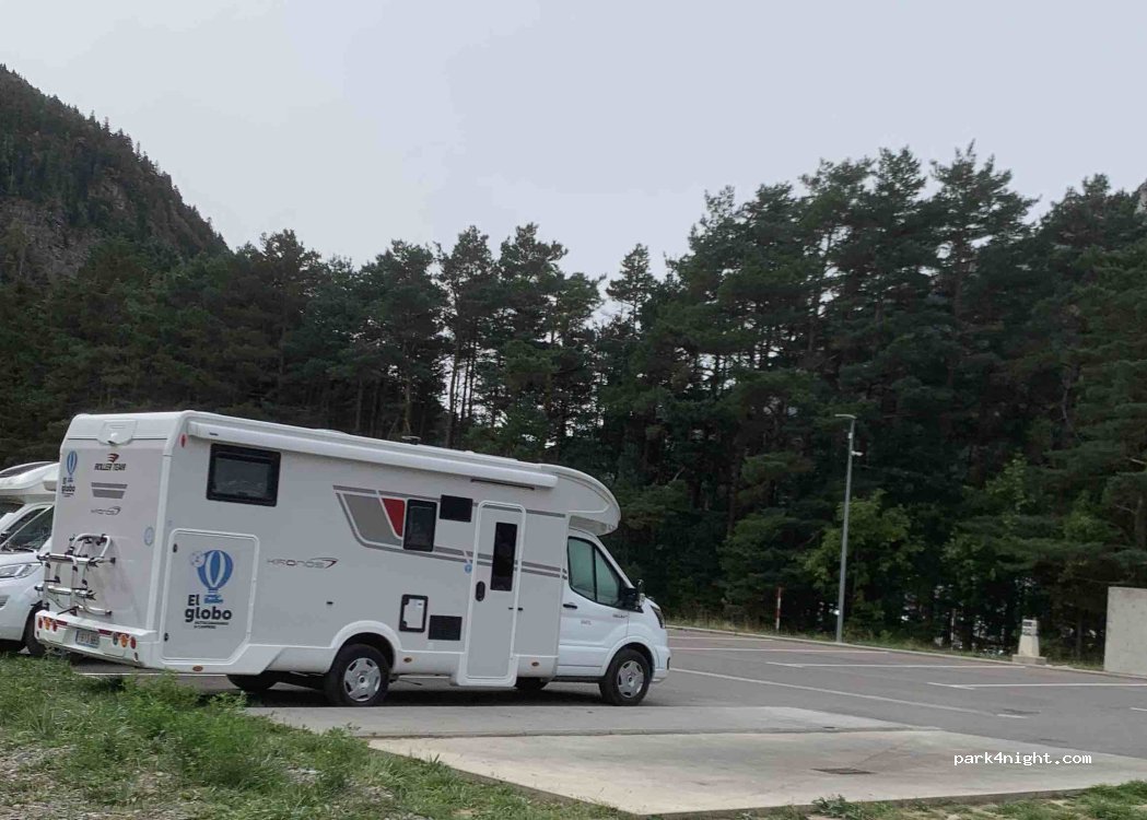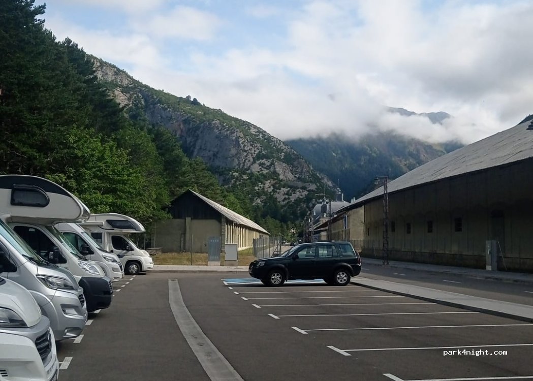 Buen sitio para pasar la noche , justo al lado parking privado con todos los servicios , aguas negras , aguas grises , llenado de agua y electricidad!! Necesitas permiso del ayuntamiento!! X eso nosotros nos vinimos a este y pasamos buena noche!! Un pueblo muy bonito y con encanto y la estación de Canfranc precioso hecho hotel 5 estrellas!! Lo recomiendo