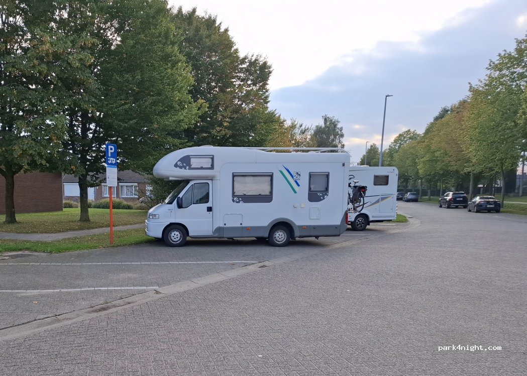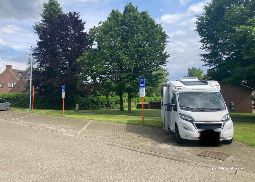 Drie parkeerplaatsen voor campers, naast een rustige tuinwijk, tegenover een sportpark met voetbal- en hockeyterreinen. Max. 48u. In het weekend komen er wat auto's toe voor training.