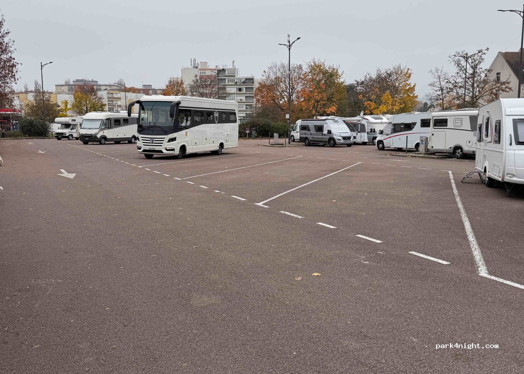 Large parking lot, close to Beaune my advice is to get there before 14.00, as it fills up with campers steadily after this time. lots of campers with trailers that park anywhere so plan your exit for leaving. quite at night supermarket and 2 fuel stations close by. Flot bleu well used and grubby due to high volumes, arrive full of water and empty of grey and black waist is my advice.