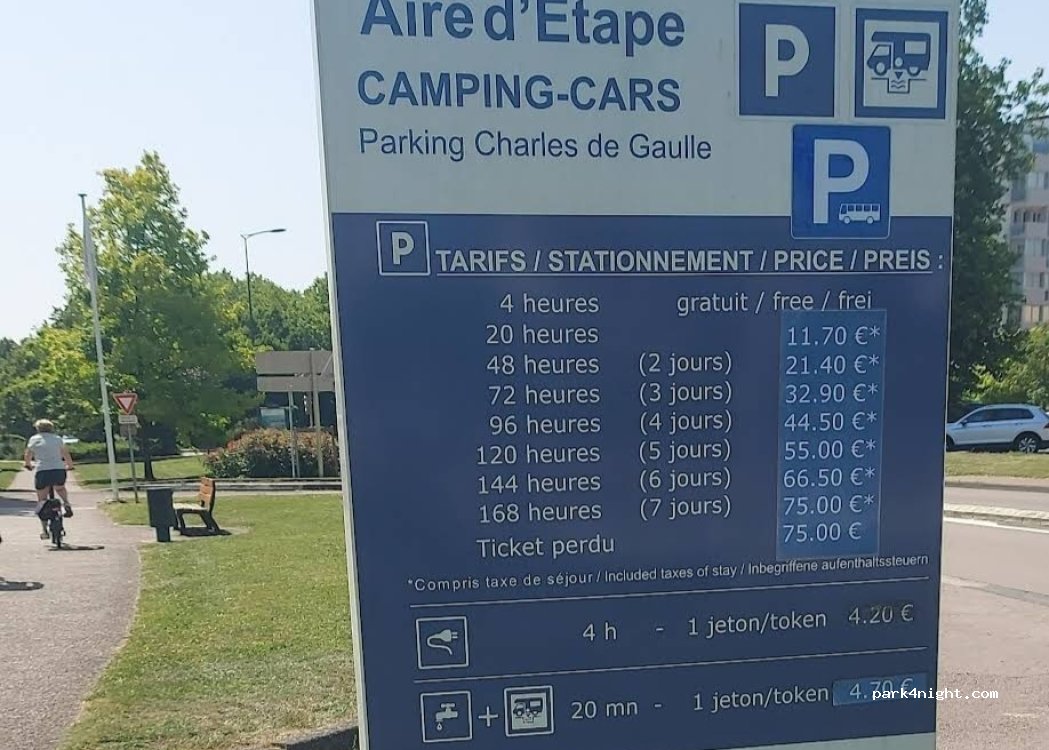 4 octubre 2025 El sitio es tranquilo a pesar de estar en medio de la ciudad y compartido con coches. No usé los servicios por lo que no puedo opinar pero es un buen lugar para visitar la interesante Beaune. Gracias al municipio