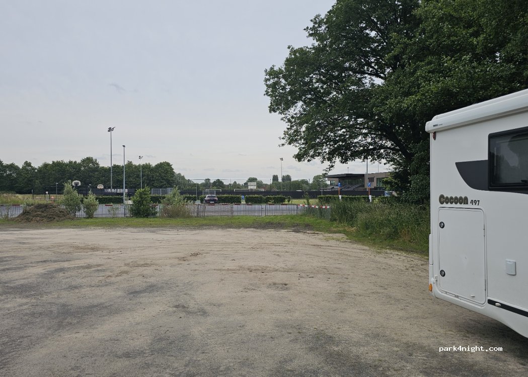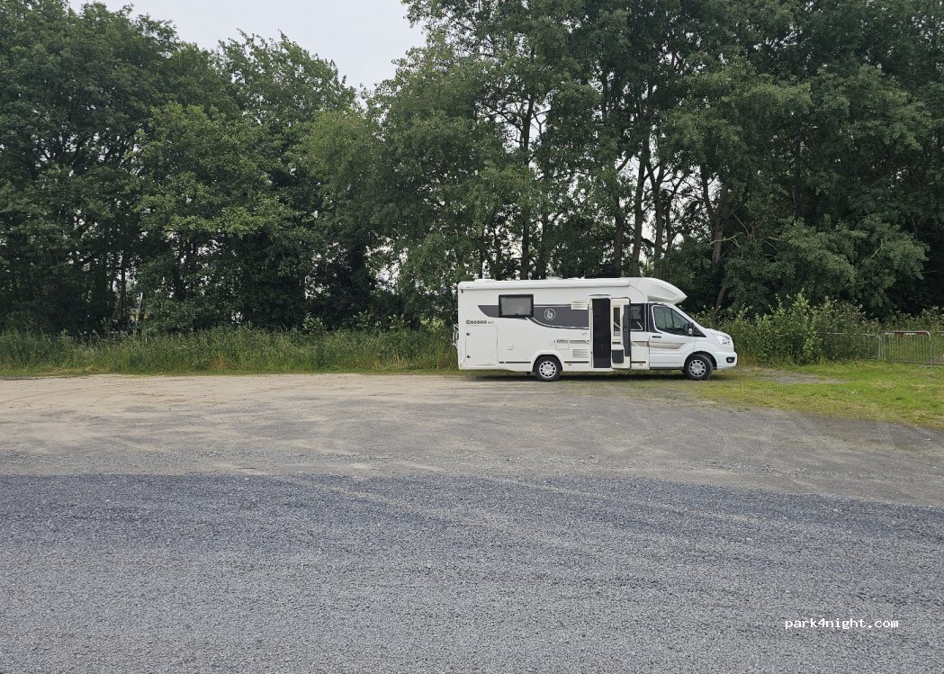 Gravelparking net voor de parking van de sporttereinen. De bomen houden het lawaai tegen van de snelweg. Er is wel nog steeds lawaai van de snelweg maar niet echt storend. Voor de rest zeer rustig. Geen diensten.