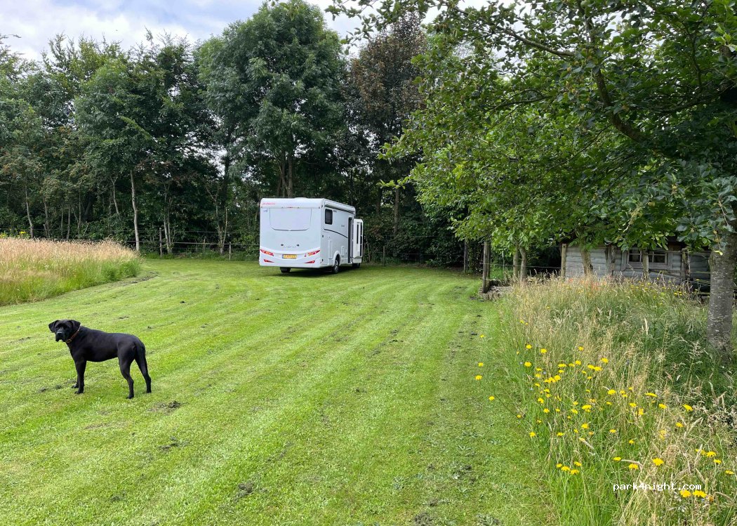 Wat fijn dat er zulke plekjes bestaan. Particulier op een mooi grasveld met vrij uitzicht. Vriendelijke eigenaar, lieve hond en mooie omgeving om te wandelen of te fietsen.