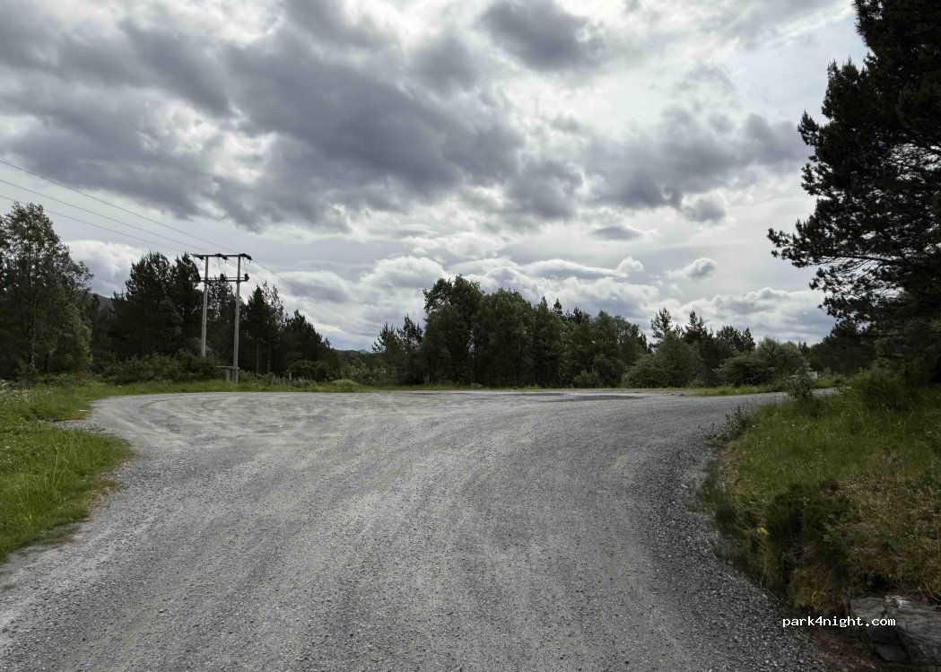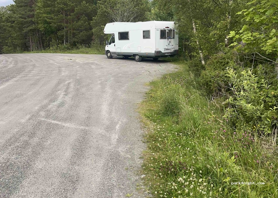 Parkplatz auf Schotter. Auch für große Wohnmobile geeignet. Abseits der Straße und mit Bäumen von dieser abgetrennt.