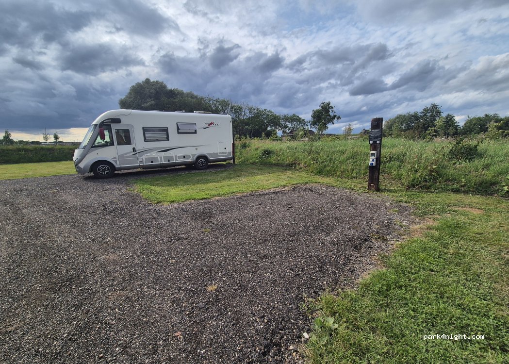 Sehr schöner neu angelegter Wohnmobilstellplatz mit neuen und sehr sauberen Sanitäranlagen. Der Preis der Dienstleistungen ist inklusive. Für eine Nacht haben wir 18,50€ bezahlt. Bezahlen kann man im Restaurant.