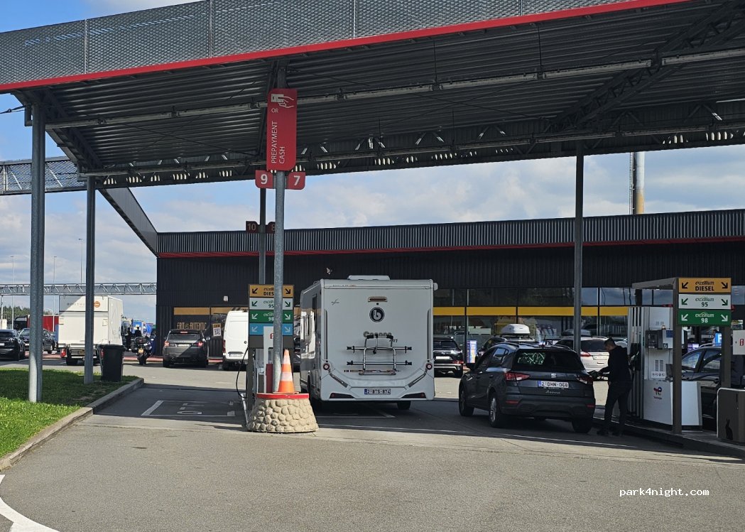 Snelwegparking voorzien voor campers maar dikwijls ingenomen door andere voertuigen. Overnachten is af te raden. In de shop van het tankstation zijn er toiletten en douches. Er zijn 2 lpg pompen.