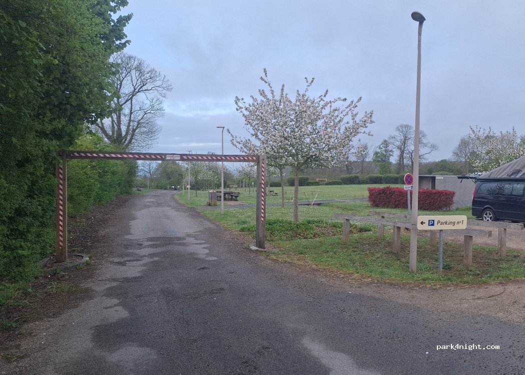Buen lugar, tranquilo con el sonido de los pájaros todo el día. A las 6:30h pasa el camión de la basura a recoger en la carretera aledaña. Baños un poco sucios. Limitación de 2'10 m de altura para los parking interiores del parque. El exterior de la foto sólo 3 plazas minimamente inclinadas. Paseo bonito, mesas de picnic y parque para niños.