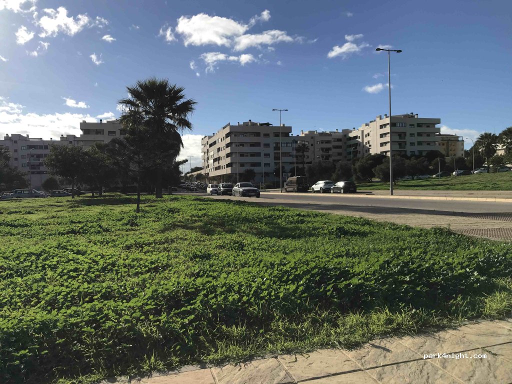 Asphalt/concrete parking with a slight slope, although there are other flat streets. It is a newly created area with green areas and children's games. Quiet and safe.