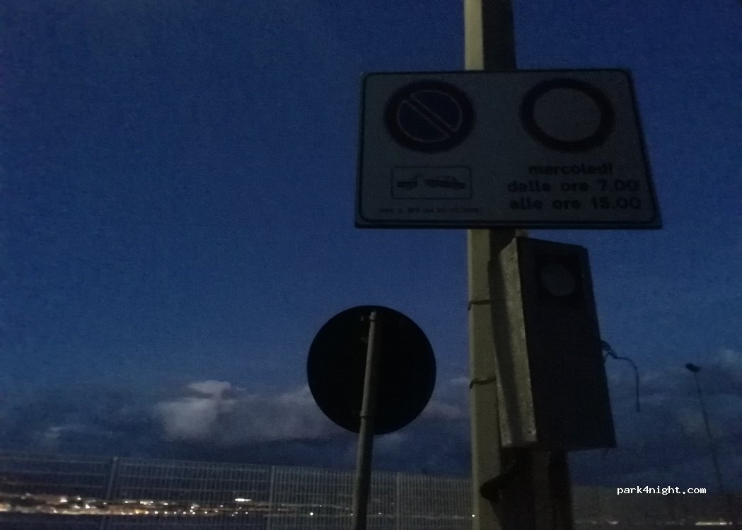 effektiv parkering nær færgen. lille park ved siden af til at gå en tur eller til at motionere i. masser af affald og vilde katte. uforstyrret nat og et tilsyneladende defekt parkometer. vi så en fejemaskine i arbejde her (siciliens eneste?). vejarbejde i gang men stadig plads nok til vores 7,5 m.