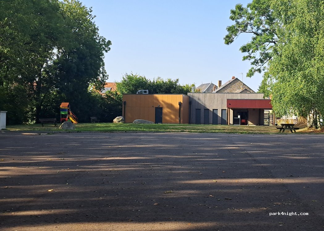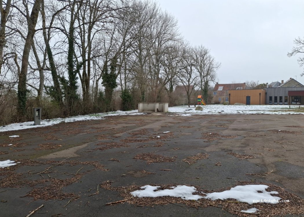 Aire communale en cours d'aménagement ( parking bitumé). Actuellement, vidanges possible, pas d'eau (robinet démonté) bornes électriques posées mais pas encore en service. Sanitaires et douches fermés à clef (attenant à la boulangerie).