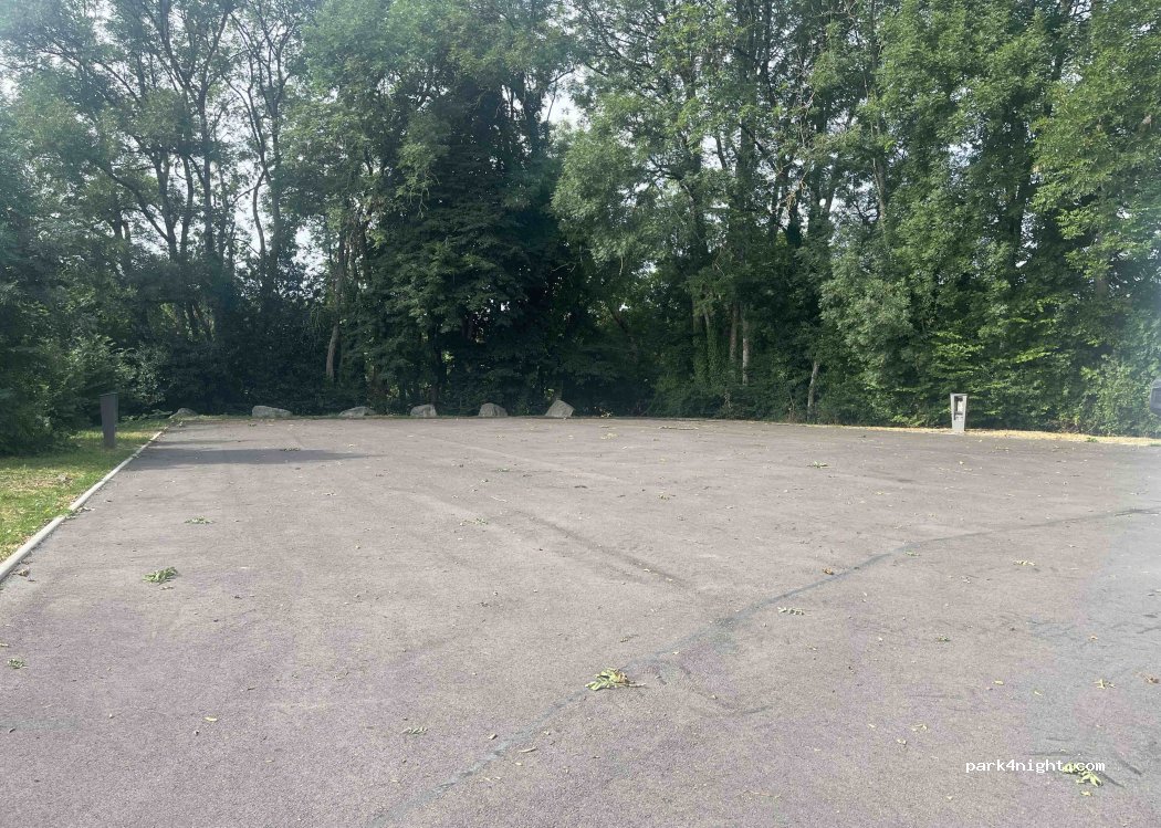 Parking en enrobé, pas besoin de cales. il n'y a pas d'eau ni d'électricité, L'aire n'étant pas encore opérationnelle, on peut juste vidanger les eaux grises et noires mais sans possibilité de rincer. Il y a une boulangerie/snack à 30 mètres.