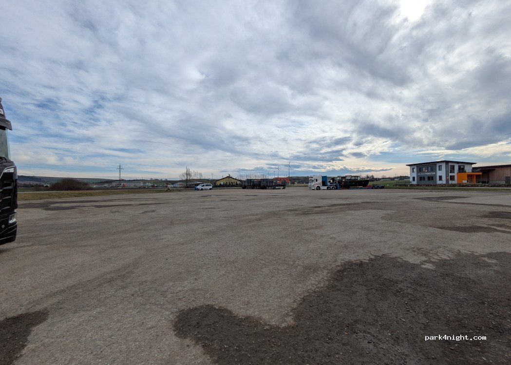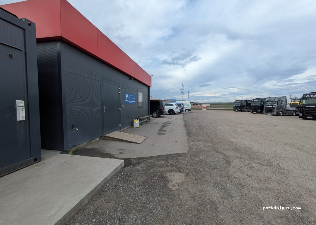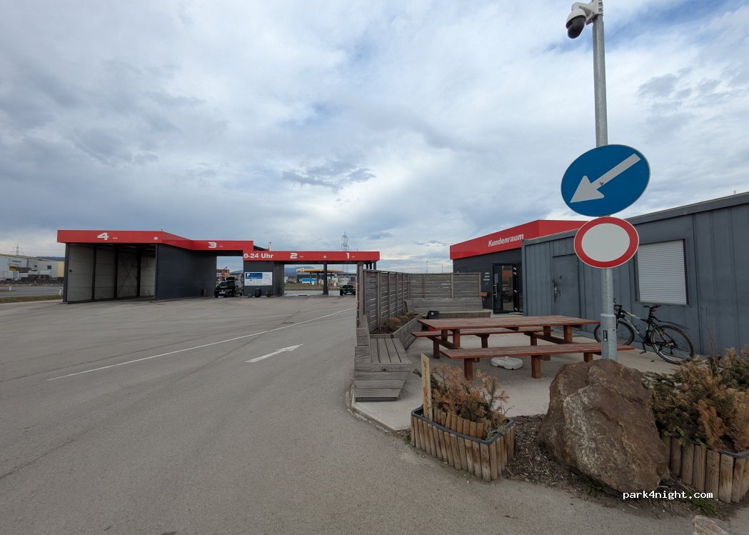 Großer LKW-Parkplatz mit Waschanlage, Sitzgelegenheiten drinnen und draußen, Toiletten und Duschen.