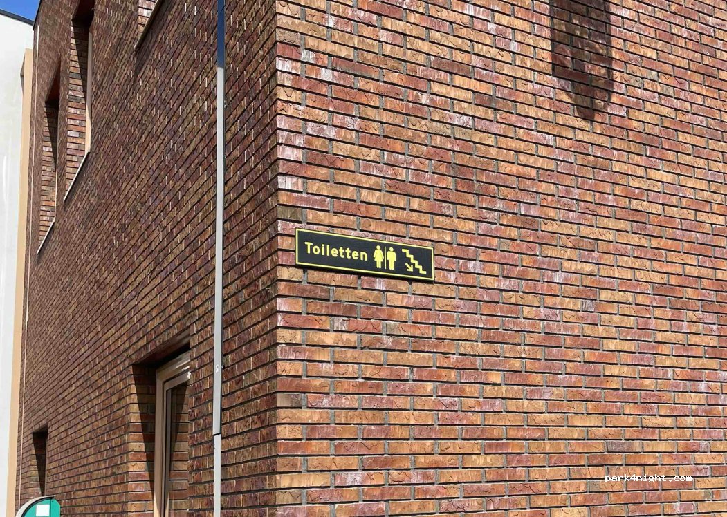 Parkplatz mit öffentlicher Toilette. Neben der Stadtgemeinde