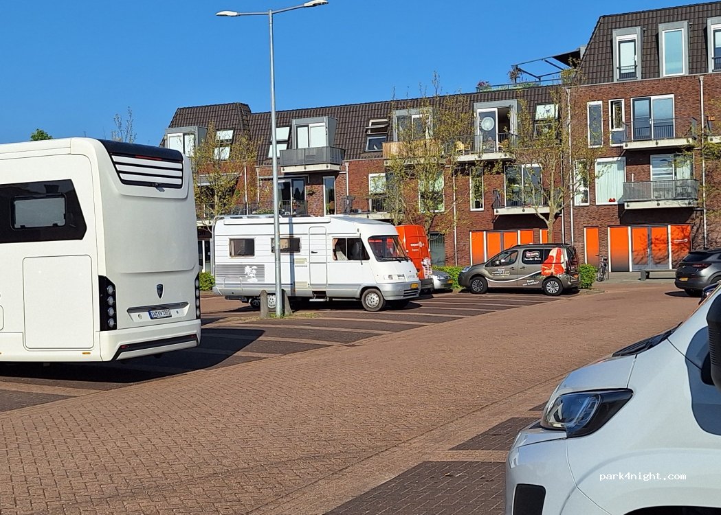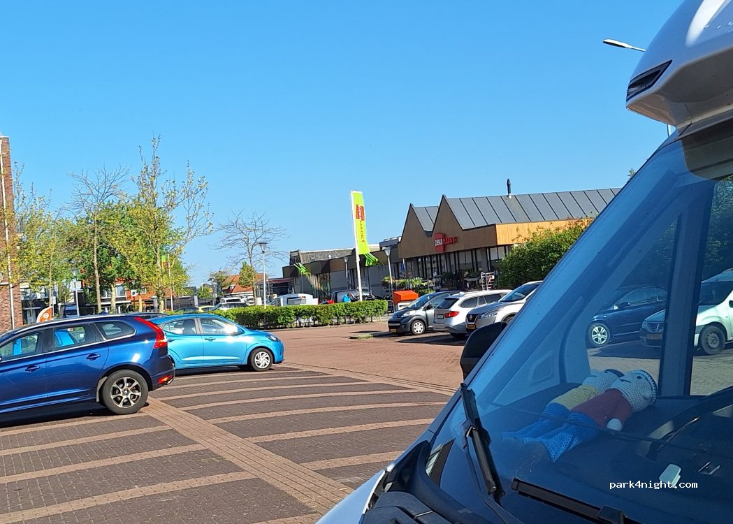 Grote parkeerplaats bij het zwembad. Er is een supermarkt in de buurt.