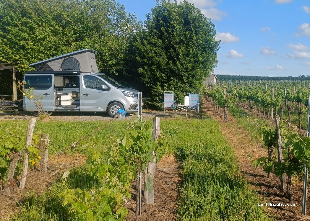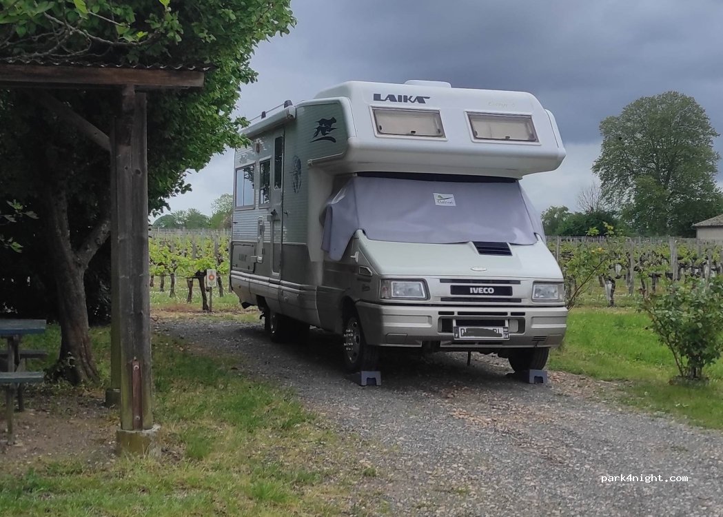 Abbiamo passato una notte in totale tranquillità in mezzo ad un vigneto. Alle 18 i proprietari fanno una degustazione di 4 vini acquistabili in loco. La città di Saint-Emilion dista 10 minuti in bicicletta. A pagamento vi è la possibilità di scaricare il Wc ed avere acqua potabile.