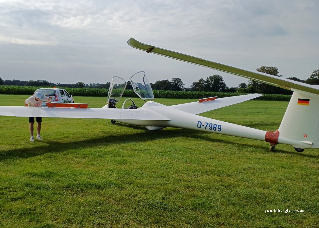 Terraza de visitantes en el aeródromo de Borghorst-Füchten. Los fines de semana de verano se pueden observar aquí las operaciones de vuelo del club. Además, desde aquí se pueden realizar agradables recorridos en bicicleta por el paisaje del parque de Münsterland.