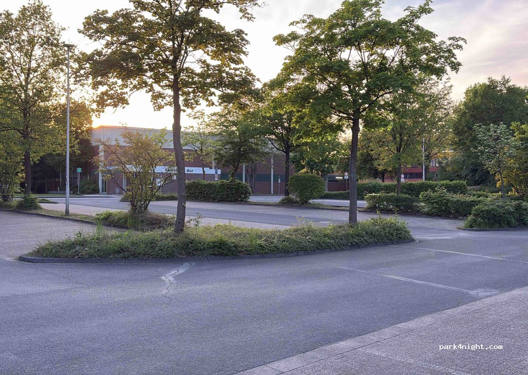 Parkplatz an einer Gesamtschule/Sporthalle. Gepflasterte Parkplätze,teilweise beleuchtet. 100m zum Kletterwald und ca.150m zu einem gr.Spielplatz. Sehr ruhig gelegen. Keine Autos die hier durch fahren. Autobahn und Zug hörbar. Durch den Sportpark kann es sein das sich auf dem Parkplatz getroffen wird um zum Sport zugehen. Mit dem Hund kann man hier auch eine Runde drehen. Es gibt 1 Mülleimer an der Bushaltestelle. Sollte Schule sein ist es hier sicherlich morgens laut und tagsüber der Parkplatz voll. Polizei fuhr Streife hat aber nicht angehalten. Bitte den Parkplatz sauber lassen und wieder sauber verlassen. Aber das sollte selbstverständlich sein. Dieser Parkplatz macht einen wesentlich besseren Eindruck als der Parkplatz vorne an der Hauptstraße.