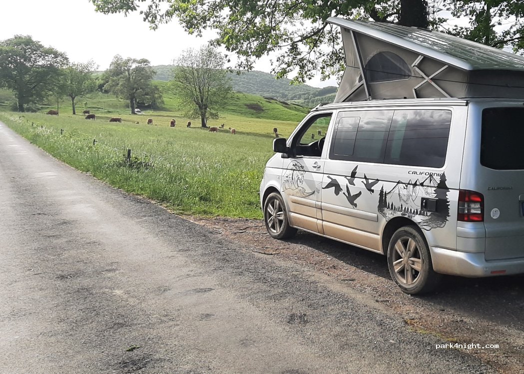 On the side of the road, near Saint Girons, flat to sleep well, next to a meadow with cows.