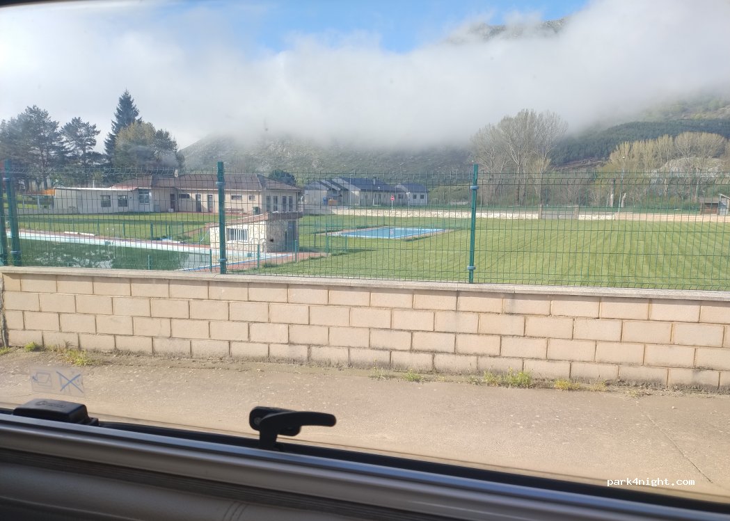 Entre el cementerio y la piscina, hay una carretera para poder pasar la noche , muy tranquilo y lejos de la principal y no oír los coches. En verano la piscina municipal la tienes al lado y si quieres rezar por alguien, el cementerio;-))).