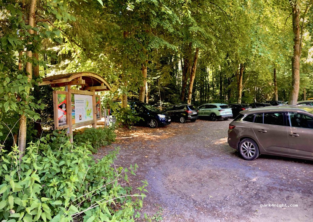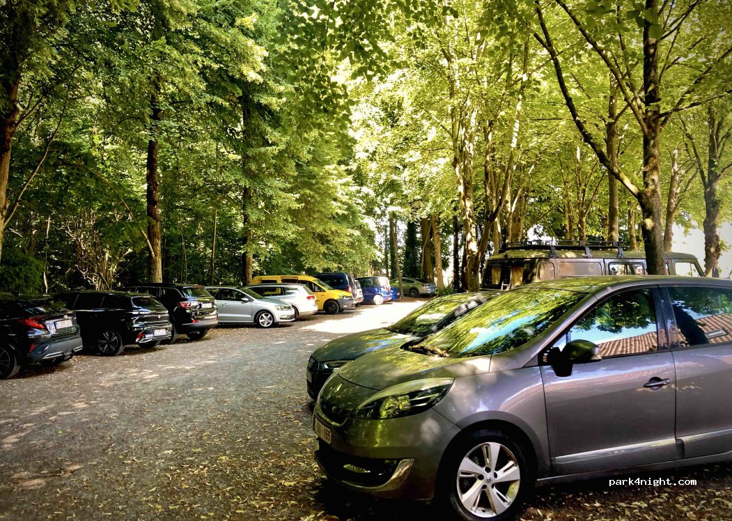 Grand stationnement entre les arbres, endroit très fréquenté. De là, vous pouvez facilement faire diverses promenades à pied ou à vélo.