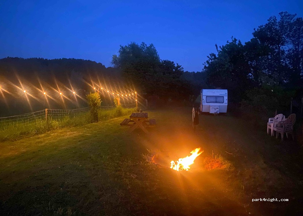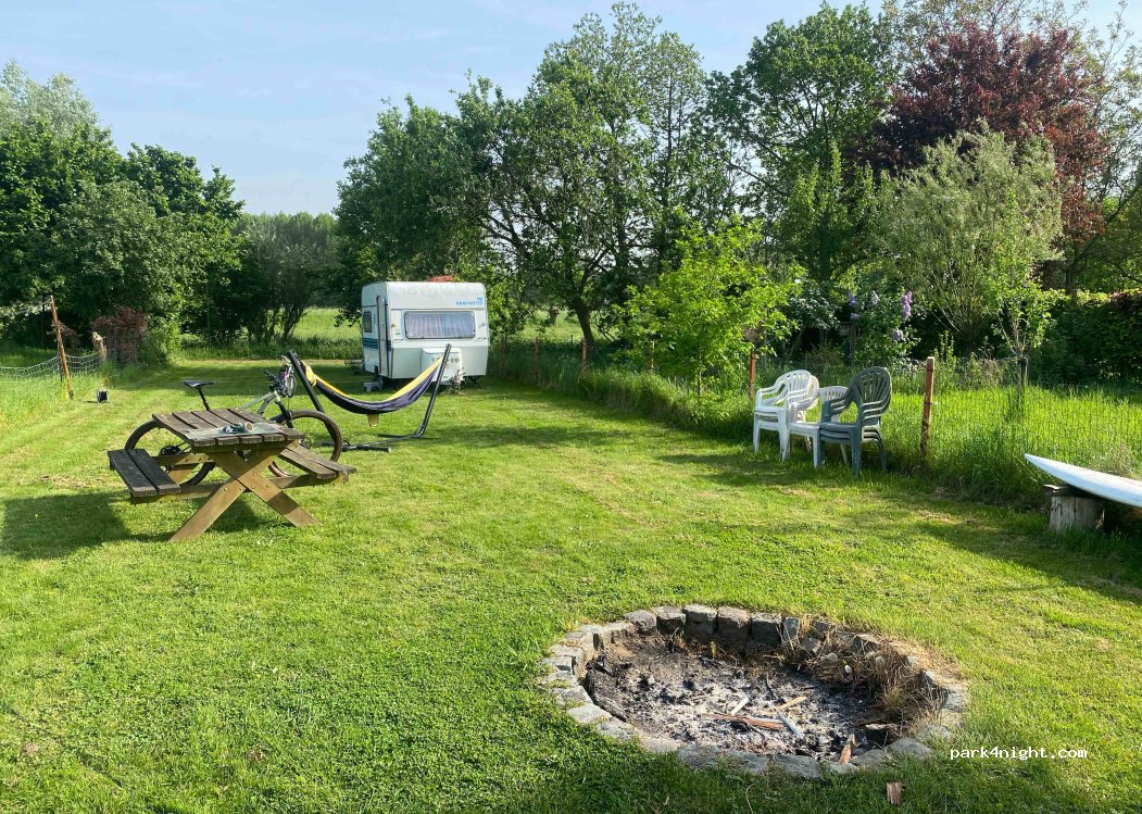 Emplacement camping-car calme au fond du jardin pour camping-cars/tentes (accessible par un chemin de terre). Espace pour accrocher un hamac et faire un feu de camp. Un éclairage d'ambiance est fourni. Cadre chaleureux et paisible, entouré de verdure. Réservation obligatoire ! Location de caravanes possible (40 €/nuit) si vous ne disposez pas de votre propre hébergement.