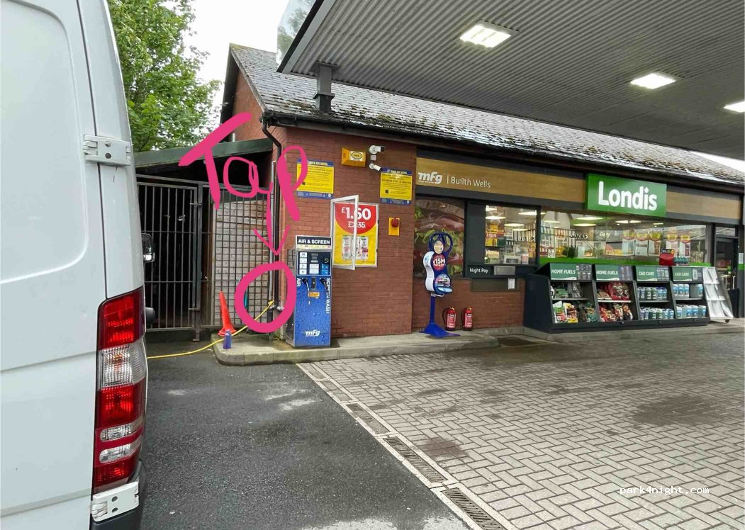 Hay un grifo de agua disponible a la izquierda de la tienda Londis, en el taller Texaco, taller que me encantaría usar. Hay otro grifo frente al taller Links de al lado, pero estaba cerrado, así que no pude comprobarlo. Un poco más lejos del taller Links hay una lavandería Revolution junto a un autoservicio JetWash. Hay mucho aparcamiento fácil en los alrededores. Ah, y, por supuesto, hay gasolina y la calefacción estaba en el Texaco.