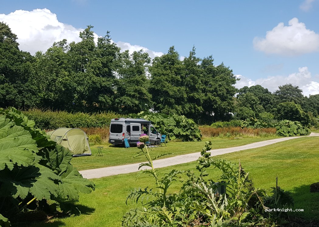 Beautifully landscaped site with (estimated) 80 pitches. The meadow is divided into several areas by hedges and ferns. A 20-minute walk to the beach. Friendly owners. Old but OK sanitary facilities.