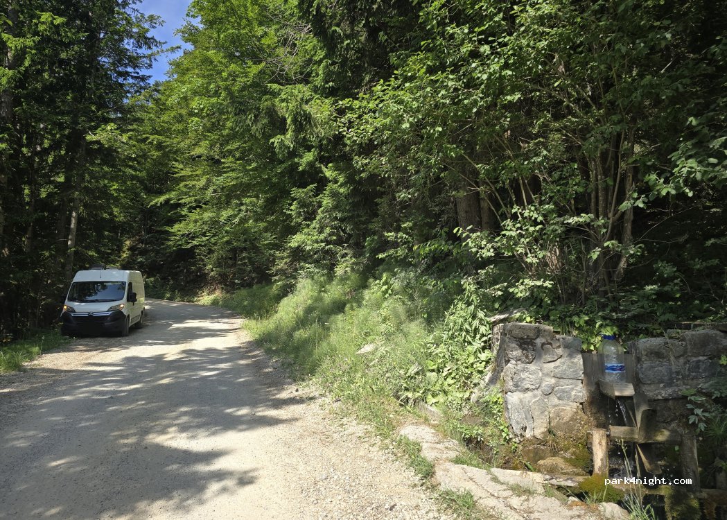 Un ruisseau avec un petit bassin/barrage permet de récupérer l'eau, tout près de l'aire de pique-nique et juste à côté de la route. Stationnement possible à proximité. L'eau peut être utilisée pour la vaisselle, le linge ou d'autres besoins. Dans le pire des cas, elle est potable car c'est un ruisseau de montagne propre. L'eau peut être récupérée avec des bidons ou des (grandes) bouteilles.