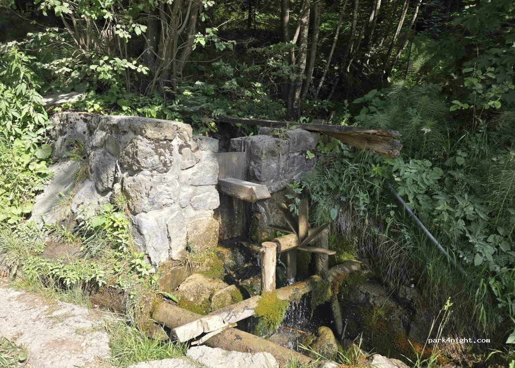Un arroyo con una pequeña poza/presa para recoger agua, muy cerca del área de picnic y junto a la carretera. Se puede aparcar cerca. El agua se puede usar para lavar platos, ropa u otras necesidades; en el peor de los casos, es potable, ya que es un arroyo de montaña limpio. Se puede recoger el agua con bidones o botellas (grandes).