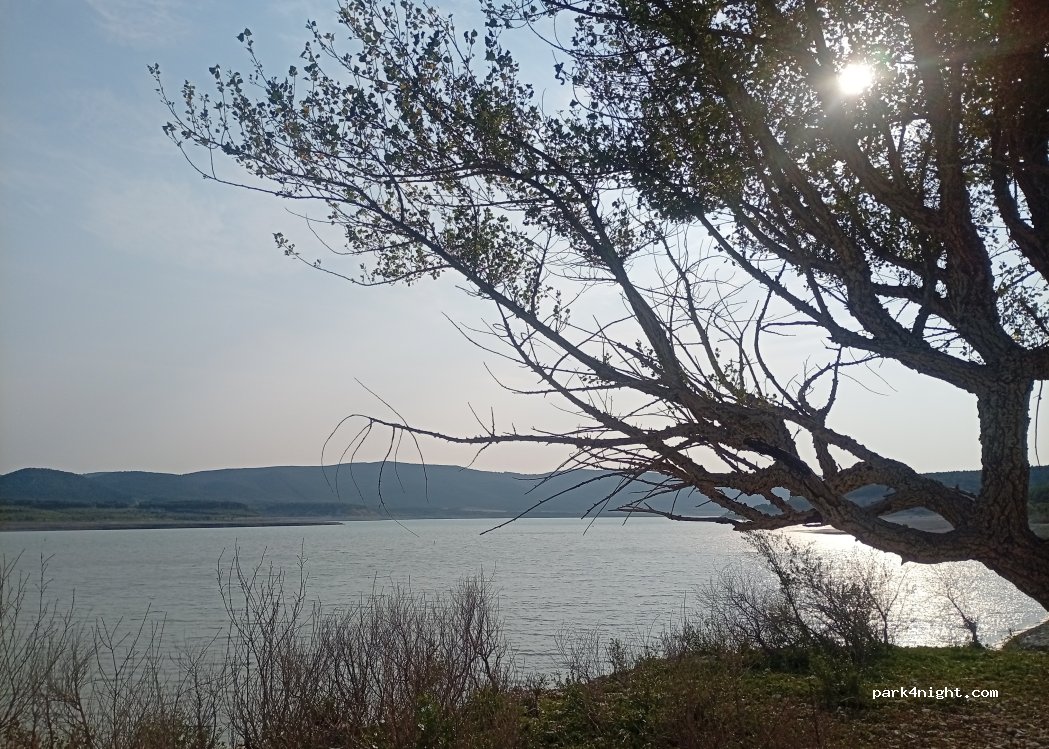Al borde del lago, con algunos árboles para dar sombra del sol en verano.