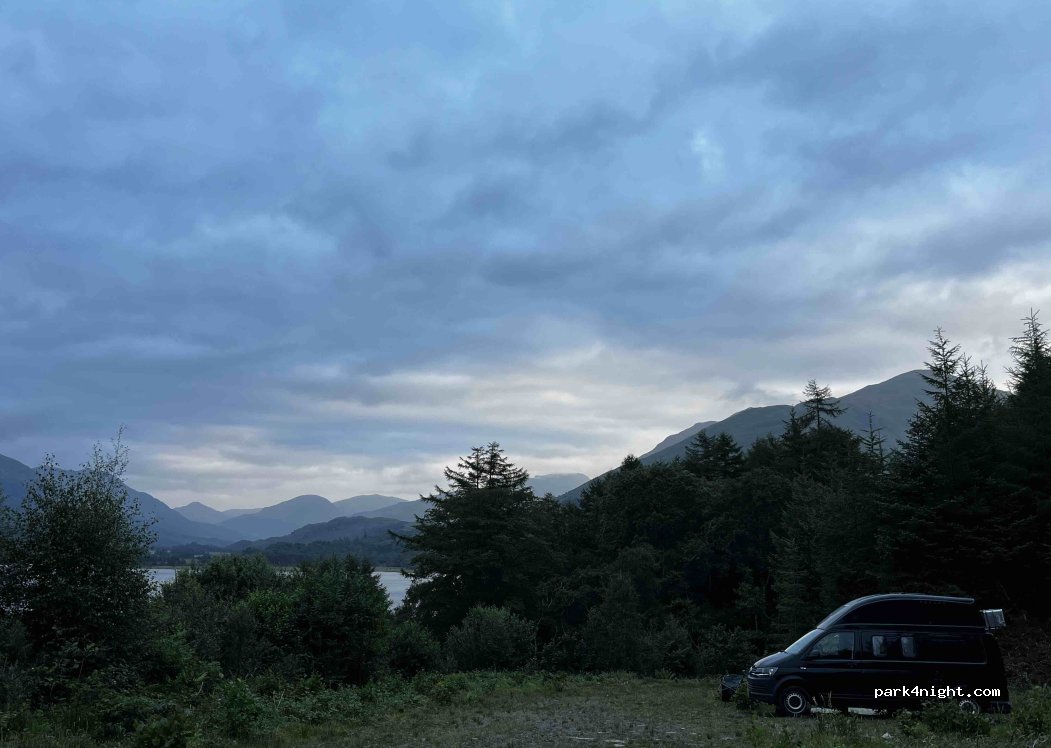 Parfait petit spot. Il y avait un van sur le parking du bas on a donc poussé un peu plus haut sur le chemin . Bon je pense que nous sommes sur un site privé d’exploitation forestière mais aucun panneau d’interdiction d’entrer. Nuit super calme et belle vue sur le loch.( midges bien évidemment car pas de vent hier soir) .